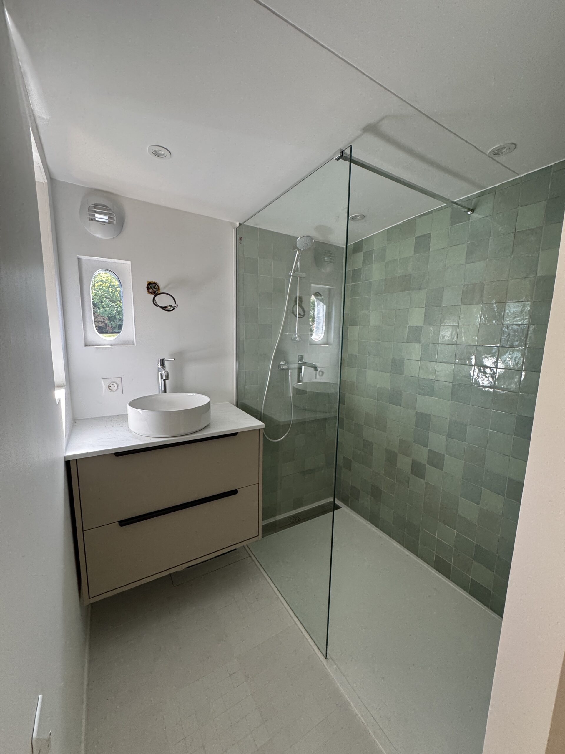 Une seconde salle d’eau attenante à la chambre principale (suite parentale d’environ 21 m²) avec douche à l’italienne et mobilier sur mesure,